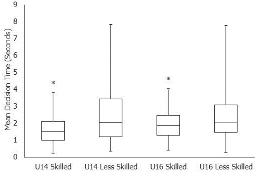 Mean decision time(s) and standard deviation between skilled and less skilled participants across both age groups. *Significantly different compared to the less skilled group (p < 0.05). Mid-line represents the median time for that group. Also note that the less skilled groups in each age range exhibited the greatest variation in decision time.