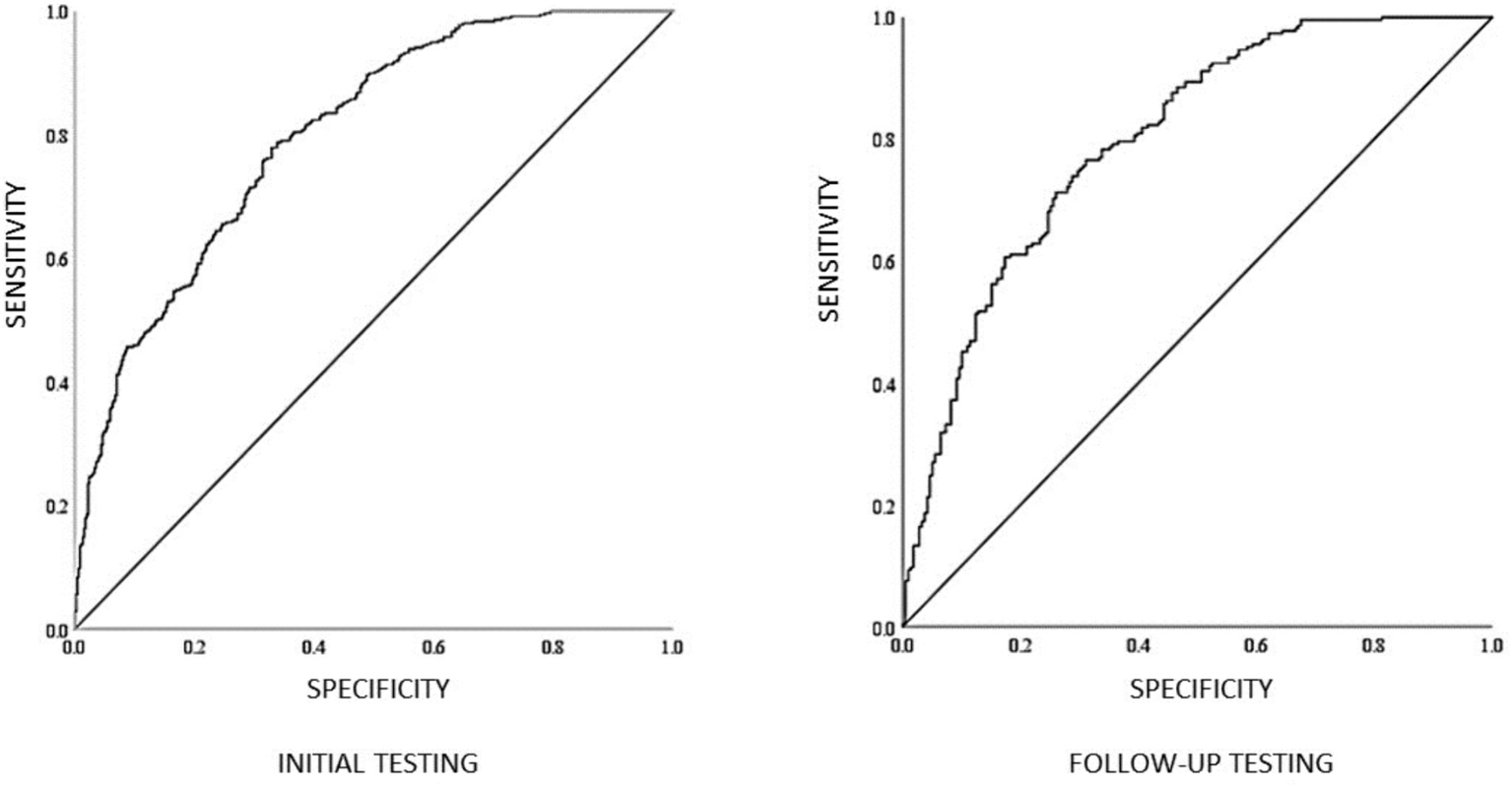 An ROC curve was used to test the ability of the combined decision and eye movement measures to classify the skill level of the participants. At the initial testing time point when using the number of fixations, total duration of fixations, and decision time, the area under the ROC curve (AUC) was 0.80, 95%CI [0.770, 0.829]. While at the follow-up when accounting for the number of fixations, total duration of fixation and decision time, the area under the ROC curve was 0.803 95%CI [0.744, 0.862], which highlights an excellent level of discrimination (Figure 5). An AUC between 0.8 and 0.9 is considered excellent discriminability (Mandrekar, 2010).