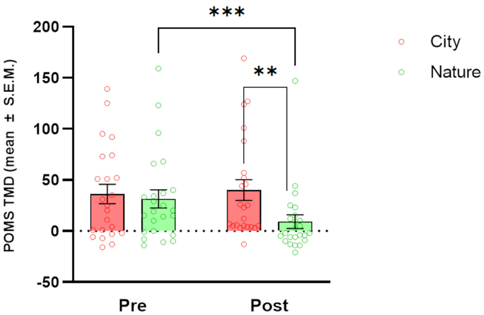 Effects of natural and urban environments on Profile of Mood States (POMS) scores. The bars represent the mean score (± SEM) of Total Mood Disturbance (TMD) measured at the beginning of the session (pre) and after the walking session (post) in the lagoon (Nature; green markers) and in the urban environment (City; red markers). **p < 0.01 and ***p < 0.001, Fisher's LSD Post-hoc test.