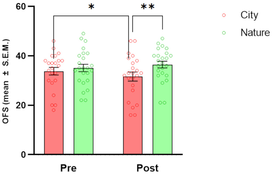 Analysis of the Openness to the Future scale (Figure 5) highlighted a significant CONDITION × TIME interaction [F(1, 21) = 5.97, p = 0.023]. Post-hoc tests showed a significant decrease in OFS scores from pre-session to post-session in the City condition (p = 0.044). When the two conditions were directly compared, there was a significantly higher OFS score in the Nature condition compared to the City condition at the post-session time point (p = 0.007).