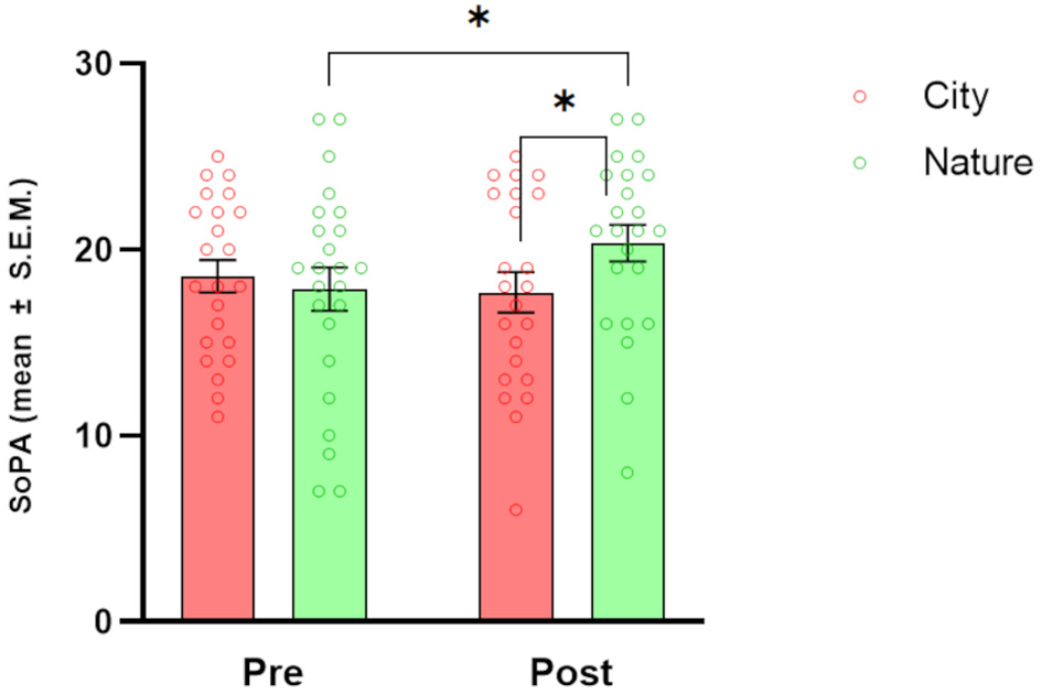 Effects of natural and urban environments on Sense of Positive Agency (SoPA) scores. The bars represent the mean score (± S.E.M.) of SoPA measured at the beginning of the session (pre) and after the walking session (post) in the lagoon (Nature; green markers) and in the urban environment (City; red markers). *p < 0.05 and **p < 0.01, Fisher's LSD Post-hoc test.