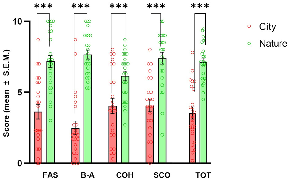 Effects of natural and urban environments on Perceived Restorativeness Scale (PRS-11) total score and factors. The bars represent the mean score (± S.E.M.) of Fascination (FAS), Being Away (B-A), Coherence (COH), Scope (SCO), and total score (TOT) measured after the walking session in the lagoon (Nature; green markers) and in the urban environment (City; red markers). ***p < 0.001, Fisher's LSD Post-hoc test.