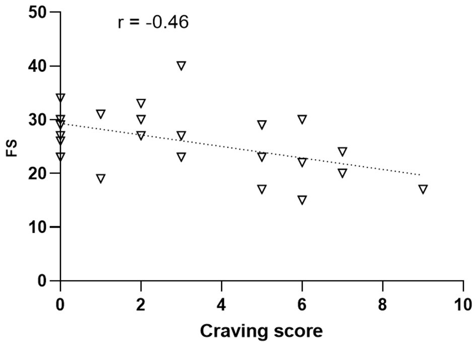 Correlational analysis between the craving scores measured after the walking session in the urban environment (abscissa) and the Flourishing Scale (FS; ordinates).