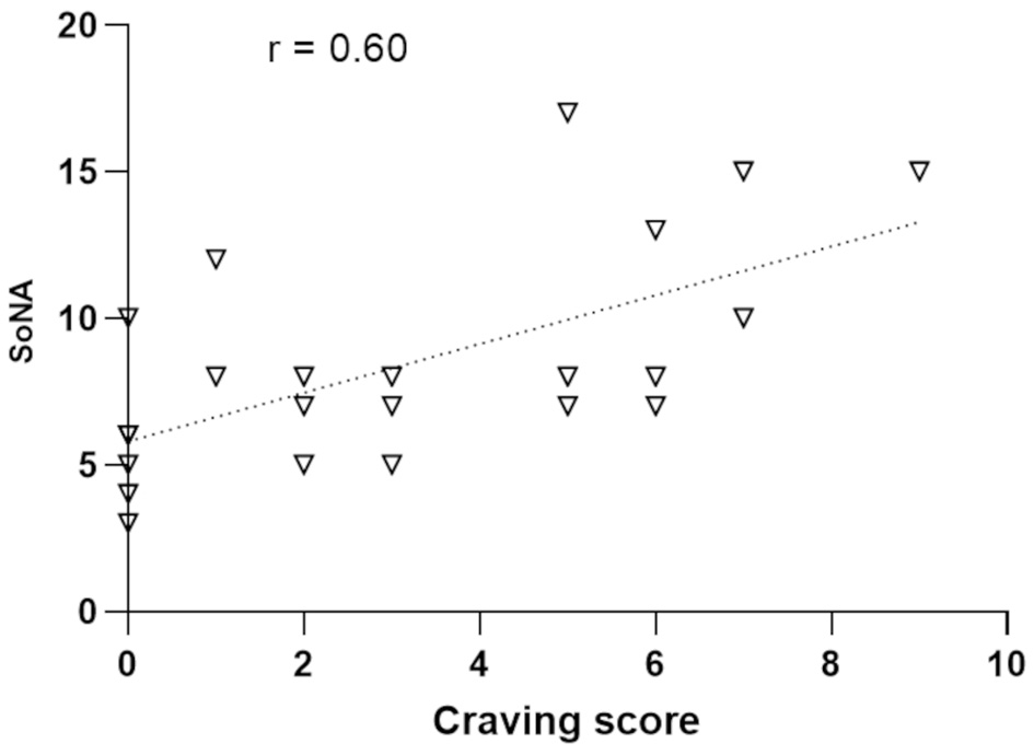 Correlational analysis between the craving scores measured after the walking session in the urban environment (abscissa) and Sense of Negative Agency (SoNA; ordinates).