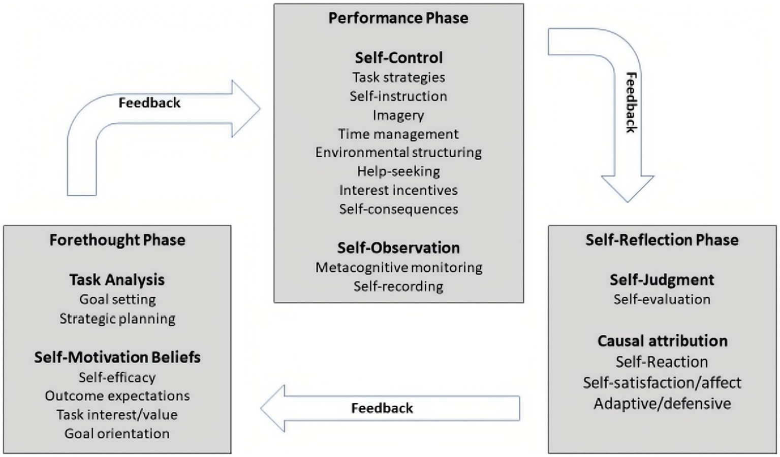 SRL specifically refers to the process whereby learners spontaneously and proactively set goals, employ various strategies, and monitor and evaluate their own behavior and learning outcomes to achieve their learning goals (Zimmerman, 2008). Based on empirical research and a social-cognitive framework, Zimmerman (2002) developed a cyclical framework of academic SRL that consists of various processes that learners purposely use to manage their behaviors, cognition, emotions, and environment to attain their personal goals (Figure 1). This framework revealed that SRL includes three stages: the forethought phase, the performance phase, and the self-reflection phase. In the forethought phase, students should analyze the learning tasks and set specific learning goals and strategies to achieve these goals. The performance phase refers to students learning based on learning strategies, and trying their best to achieve their learning goals (Zimmerman, 2002). During these processes, students could be aware of their performance with regard to certain learning goals, and need to monitor the appropriate learning strategies in order to achieve their goals. The self-reflection phase indicates how students evaluate the correlations between their learning results and learning strategies in order to determine the effectiveness of the learning strategies. This SRL model has been empirically researched and applied to the learning of various disciplines, such as mathematics (Chen and Zimmerman, 2007).
