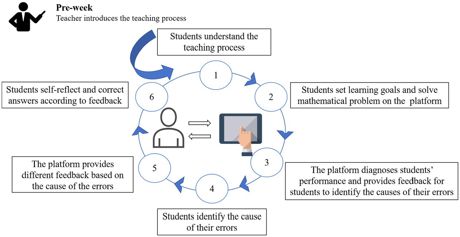 The teacher introduced the teaching process before learning so that students could understand the process. After that, students set learning goals and solved mathematical problems on the platform. The platform automatically diagnosed students’ performance and provided feedback for them to identify the causes of their errors. Students identified the causes of their errors based on the feedback from the interactive e-book editing platform. The platform provided different feedback based on the cause of the errors. Students self-reflected and corrected their answers based on the feedback results. The specific approach is shown in Figure 3.