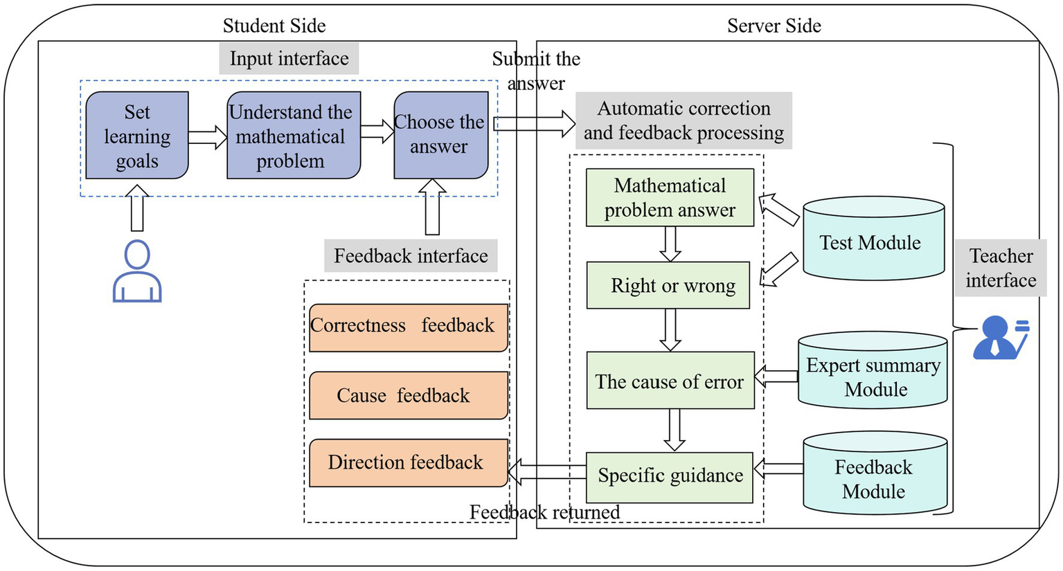 The server side consists of automatic correction and feedback processing. The teacher interface consists of a test module, an expert summary module, and a feedback module. In the test module, teachers can plan online learning activities, including setting learning goals, organizing the mathematical problem test and setting up the mathematical problem’s correct answer. In the expert summary module, teachers can summarize the cause of error for the mathematical problem test. In the feedback module, teachers can give specific guidance based on the cause of error. Then, teachers upload these course materials to the platform. The teacher’s edit interface is shown in Supplementary Figure 4. Teachers can preview the courseware, insert test modules and pictures, and so on.