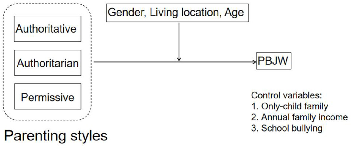 The purpose of this study is to explore the relationship between different parenting styles and PBJW in children and adolescents and to test the potential moderating effects of gender, living location, and age on this relationship. Specifically, the objectives are: (1) to identify the potential impact of different parenting styles on PBJW in children and adolescents. Specifically, authoritative parenting is positively associated with PBJW, and authoritarian and permissive parenting styles are negatively associated with PBJW. (2) to examine whether demographic variables such as gender, living location, and age act as moderating variables that influence the relationship between different parenting styles and PBJW. Based on the preceding discussion, the following hypotheses are proposed, as shown in Figure 1.