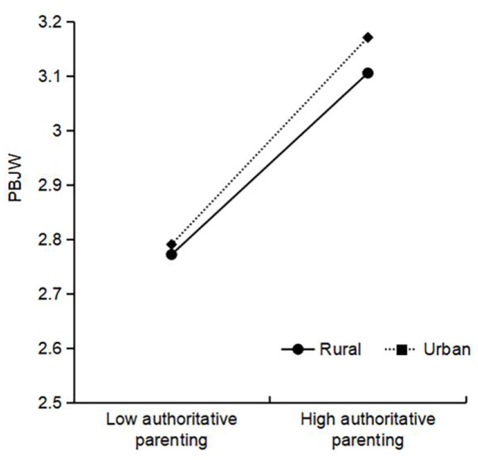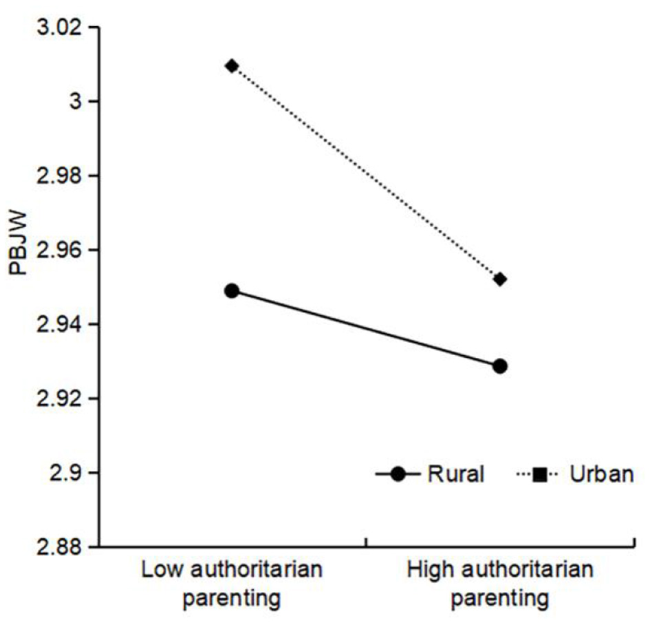 Living location may moderate the relationship between parenting styles and children and adolescents' PBJW. With the acceleration of reform and opening up and globalization, the influence of Western liberal ideology is stronger in cities (Chen and Li, 2012; Lin and Wang, 2022). Because cities have a stronger democratic and liberal atmosphere, children and adolescents growing up in such environments have a stronger sense of freedom and independence and perceive parent-child relationships as more equal (Lin and Wang, 2022). As a result, they are more eager for their parents to treat them in an autonomous manner (Lin and Wang, 2022). In contrast, in rural areas, due to limitations such as economic and social living conditions, which give children and adolescents a narrower range of social contacts, this leads to a lesser influence of their Western liberal ideas (Chen and Li, 2012). As a result, rural areas have a stronger culture of collectivism, patriarchal authority and filial piety, and children and adolescents are taught early to be submissive, respect authority and maintain family relationships (Chen and Li, 2012; Wang et al., 2024). This leads to rural children and adolescents have a weaker need for autonomy (Guo et al., 2005). Previous studies have indicated that among Chinese urban adolescents, perceived authoritarian parenting styles tend to diminish their love and gratitude toward their parents over time, whereas this trend is not observed among rural adolescents (Lin and Wang, 2022). In summary, parenting styles have different effects on the development of children and adolescents in urban and rural areas. However, there is currently no research comparing the differences in the relationship between different parenting styles and PBJW among urban and rural children and adolescents.