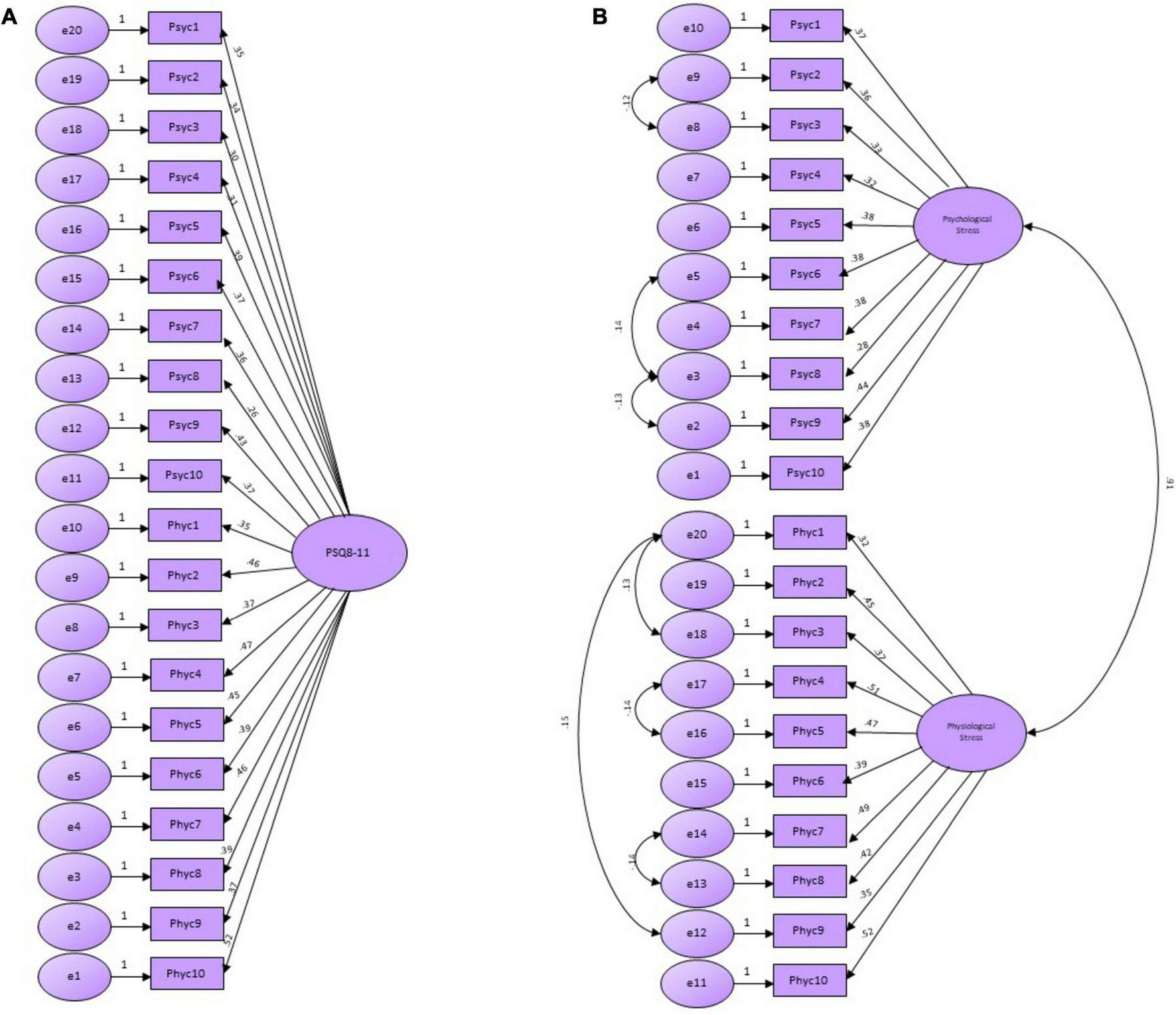 (A) Confirmatory factor analysis models of the PSQ8-11. (B) Confirmatory factor analysis models of the PSQ8-11.