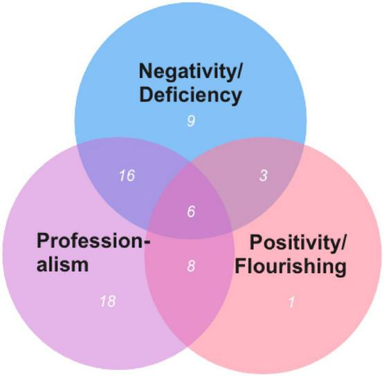 All of the 61 studies that were reviewed met at least one of the teacher wellbeing approaches, but some met two (16+3+8) or even three (6). Professionalism was the most prevalent approach. In total, 48 of the listed papers were evaluated in part or entirely under this category. 18 of the 48 papers were categorized entirely under the professionalism approach. This was followed by the negativity/ deficiency approach. In total, 34 of the examined studies applied partly or fully this approach. Of them, while 9 of them were solely categorized under the negativity/ deficiency approach, 16 take into consideration of both professionalism and the negativity/ deficiency approach. The least prevalent category was the positivity/ flourishing approach with 18 of the included studies included in this category. It was found that only one study solely focused on the positivity/ flourishing approach.