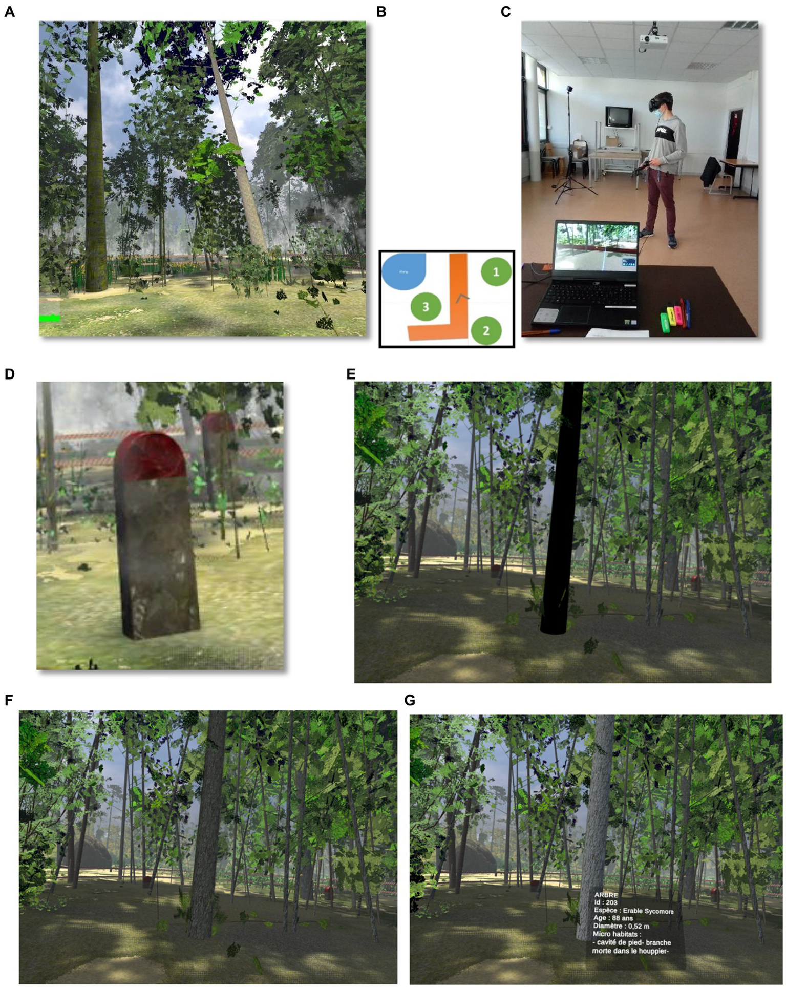 Snapshots of the IVR environment with (A) a forest area; (B) a reproduction of the map accessible in the virtual environment, including a body of water (blue), the three zones (green) and a path (orange); (C) a participant during the task; (D) an example of a marker stone, with the textual information which popped when targeted and selected; (E, F) an example of a flashing tree, and (G) in white, the textual information which popped on a targeted and selected tree: Tree; Id: 203; Species: Sycamore Maple; Diameter: 0.52 meter; Microhabitats: root cavity, dead branch in crown.