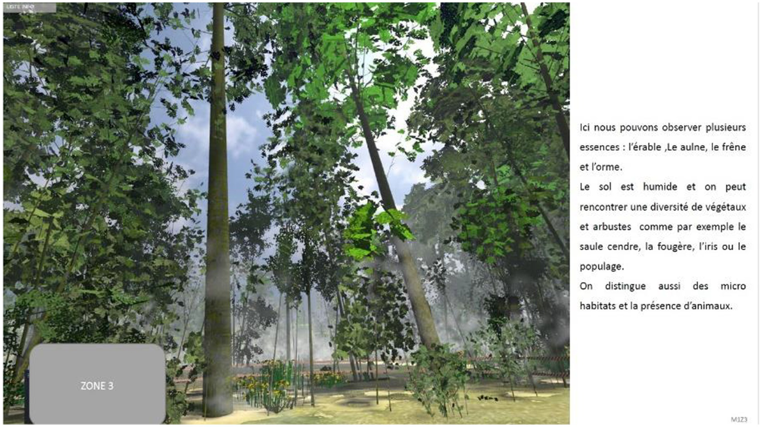Example of multimedia feedback given to the students. Here is the English version of the textual information on the right of the picture: “Here, we can observe several species: maple, alder, ash and elm. The soil is moist, and a variety of plants can be encountered, including ash willow, fern, iris and marigold. There are also micro-habitats and the presence of animals”.