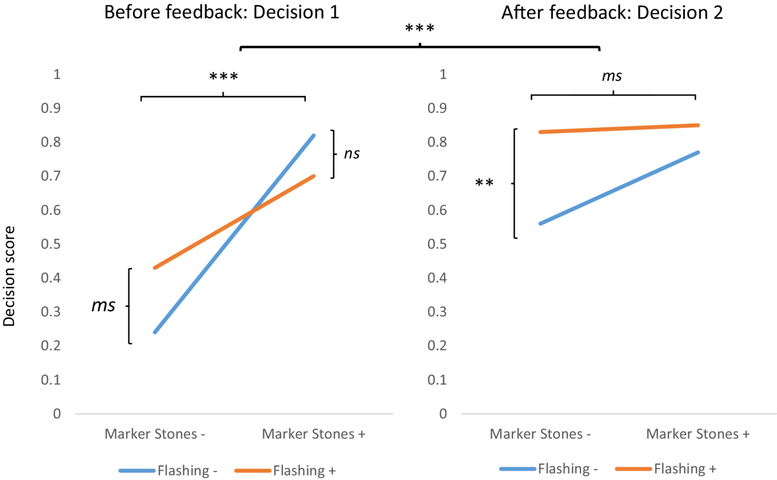 H4: We expected to observe an interaction between signaling and feedback on decision performance, with learners in the signaled conditions outperforming those in the non-signaled condition for the second decision after the feedback. The internal matching between the stored task-relevant information before the feedback and the relevant information provided by the feedback would be facilitated in the signaled conditions, thus facilitating the elaboration of a high-quality mental model of the various forest ecosystems. In the non-signaled condition, learners might store both irrelevant and relevant ecosystem-related information before the feedback, making internal processing of the feedback more difficult and potentially producing subsequent interference.