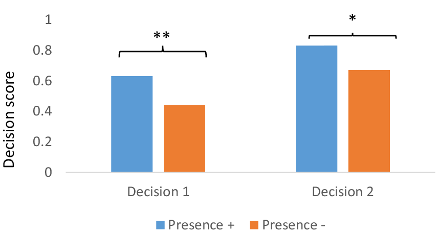 H5: Regarding justifications, we expected a higher number of correct justifications of decisions made in the signaled conditions than in the non-signaled condition. Furthermore, signaling was expected to increase the number of justifications based on considerations of ecosystem biology rather than justifications based on human wellbeing and comfort. Finally, regression and covariance analyses were run to explore the relations between subjective measures, and in particular realism, presence and immersion, perceived task facility-difficulty, usability of the environment’s functionalities and decision performances in the four experimental conditions. This led to H6, namely an expected significant covariant relation between presence and performance, which would be consistent with the immersion principle (Makransky, 2022).