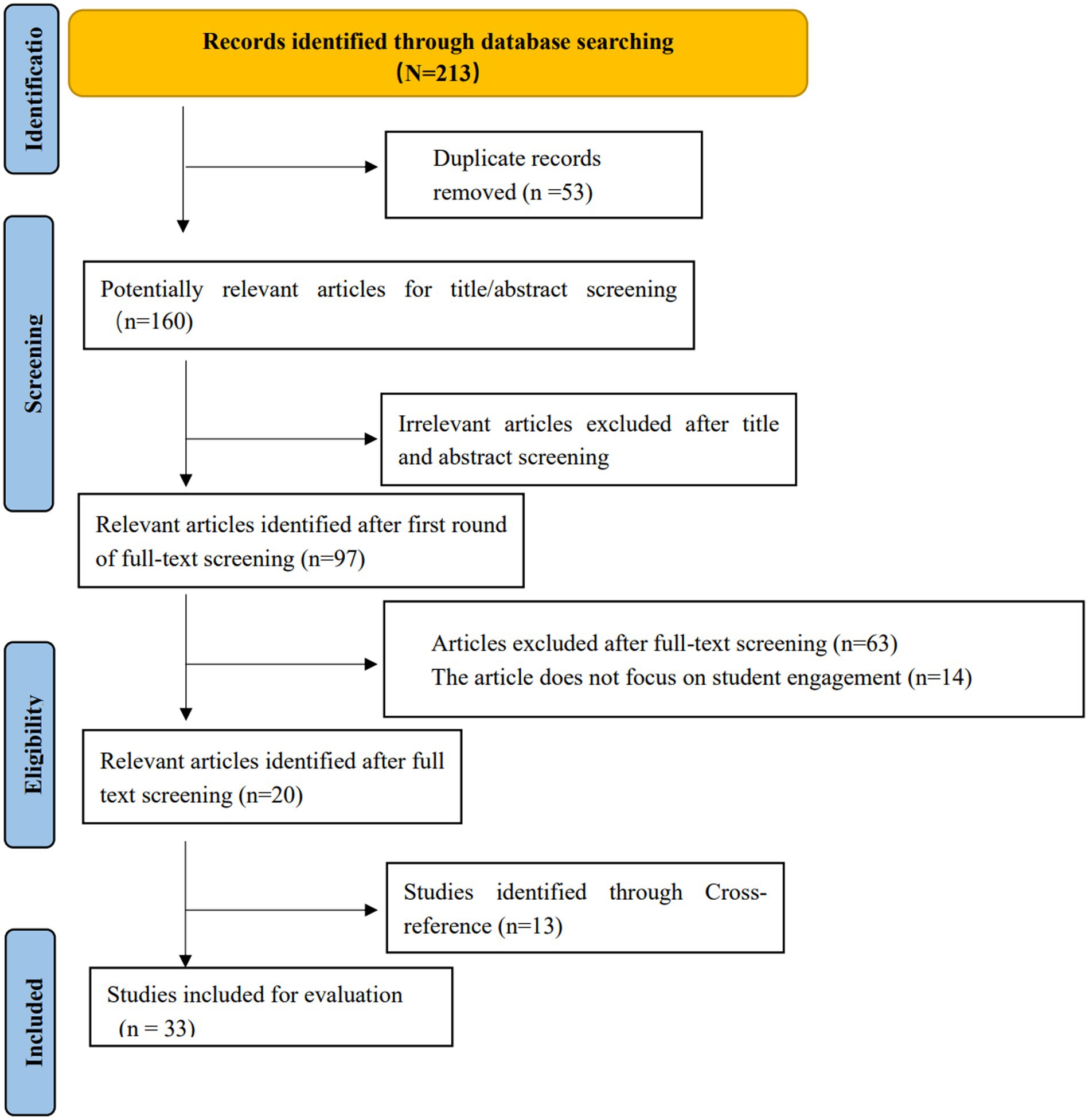 To ensure the quality of the literature, we selected only peer-reviewed journal articles published in English in the last decade. The main purpose of this article was to review the impact of VR on student engagement. Therefore, we selected only review articles on the impact of VR on student engagement in educational settings. Articles that were not written in English did not discuss the impact on engagement from a student perspective, and were published beyond the previously established time and language were excluded. In addition, a selection of articles was identified and assessed by manually searching the references of articles related to the topic, of which 13 met the eligibility criteria. Therefore, 13 additional articles were added to the 20 identified. In total, 33 articles that met these eligibility criteria were included and reviewed here. Full-text versions of the articles were obtained, with each article being reviewed and confirmed as appropriate by the authors. Finally, to maximize transparency and traceability, we list the rationale and relevant evidence for all articles included (see Table 1). The process of article selection followed the Preferred Reporting of Items for Systematic Reviews and Meta-Analyses (PRISMA) Statement (Moher et al., 2009; see Figure 1). Figure 1 illustrates the process of article selection.
