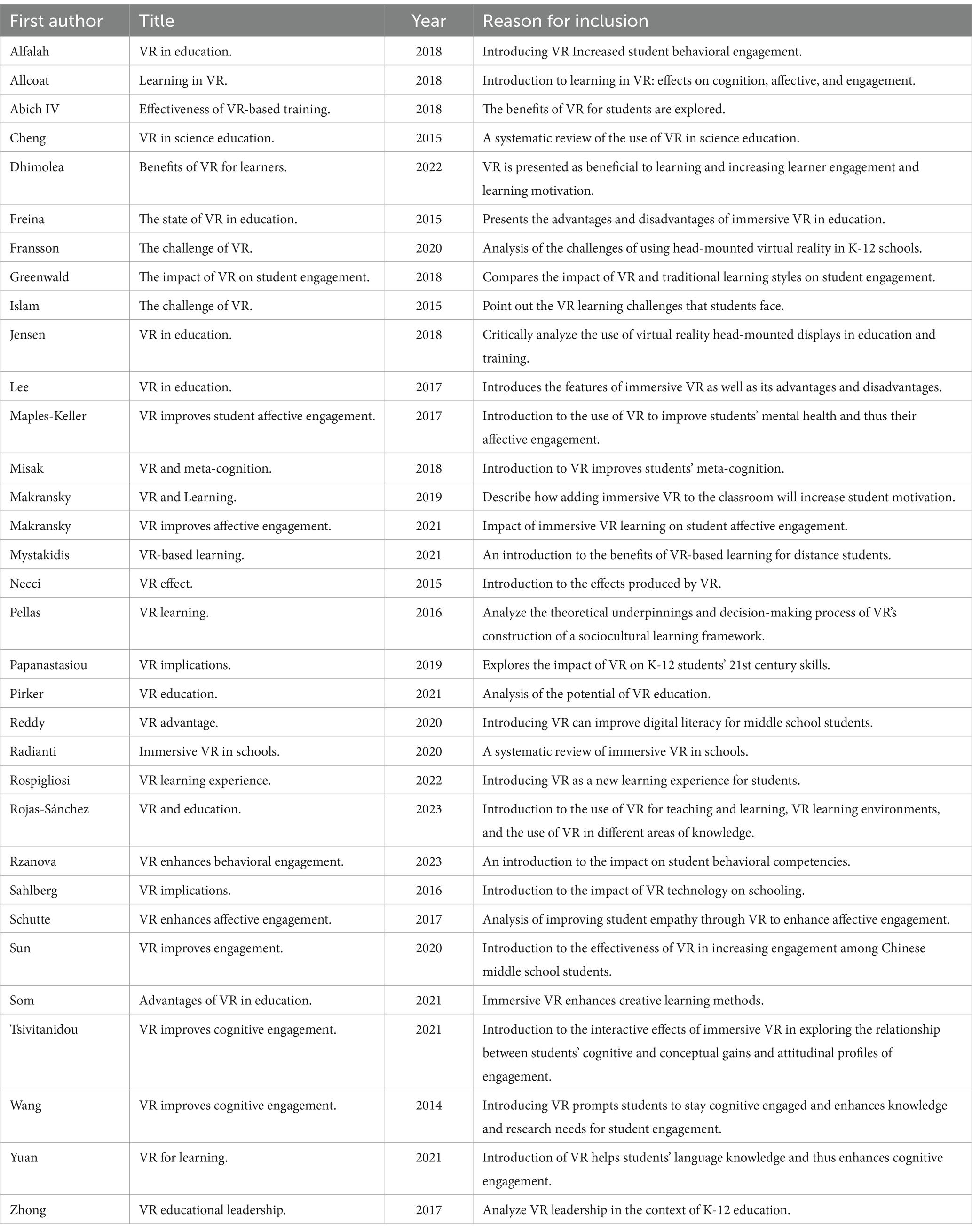 To summarize, the differences in the number of citations for these articles highlighted their different levels of influence in the area of VR’s impact on student engagement. However, there were some limitations to the review methods. For example, some articles might not have fully reflected their impact on the field in the current citations due to their short time frames, which might have resulted in less comprehensive findings. Furthermore, the literature included was small, and in the future consideration would be given to expanding the search of literature and databases, such as PubMed and Web of Science databases, as well as expanding the search with keywords, such as “students’ attitudes toward VR.” In addition, the inclusion and exclusion criteria might have limited the generalizability of the results of the review, and therefore more caution was needed when generalizing the results of the review.