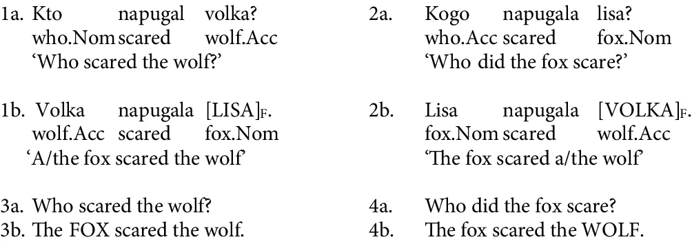 Due to the relatively free constituent order in the Russian language, Kallestinova (2007) and more recent studies by Luchkina and Cole (2021), Ionin et al. (2023a), and Laleko (2022, 2024) have investigated the role of word order in signaling sentence focus. This research has demonstrated that the SVO and OVS orders in Russian correspond to distinct configurations in terms of information structure. In the baseline SVO order, the subject is generally assumed to be part of the ongoing discourse, while the object is considered new information and is in focus. Conversely, with OVS order, the object is established in the discourse, i.e., is topical, while the subject takes center stage in the listener’s attention, i.e., is in focus.