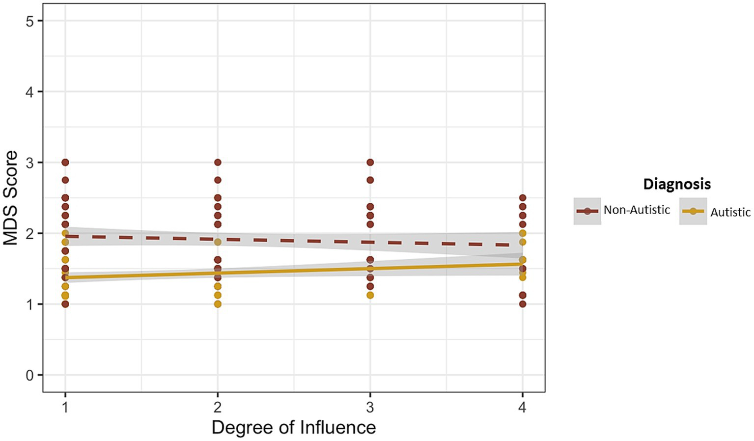 When it comes to estimating the influence of others on the decision to intervene, there is a marginally significant interaction effect. As shown in Figure 2, moral disengagement does differentially affect influence ratings in autistic versus nonautistic participants, F (1, 261) = 3.583, p = 0.059.