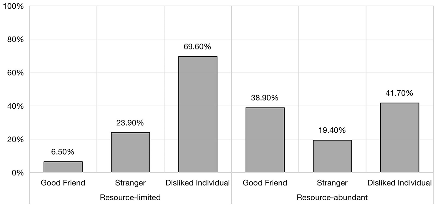 Children participated in our trials featuring limited or abundant resources and three peer relationships, and had the option to use an extra bucket to achieve equal token distribution (some participants did). The aforementioned to, wasting resources to achieve equal allocation was only 20.7%, and further chi-square results indicate that the number of resources and peer relationships had a significant effect on children's equal allocation (χ2 = 13.13, df = 2, p = 0.001). Notably, children's tendency to make equal allocations toward disliked individuals was most pronounced regardless of the resource quantities (see Figure 3). When children faced with disliked individuals, those in the resource-limited group were more likely to discard resources in order to make an equal distribution (70%), compared to those in the resource-abundant group (42%). These findings suggested that children with limited resource demonstrate a greater willingness to sacrifice resources in order to achieve equality, especially when confronted with disliked individuals.