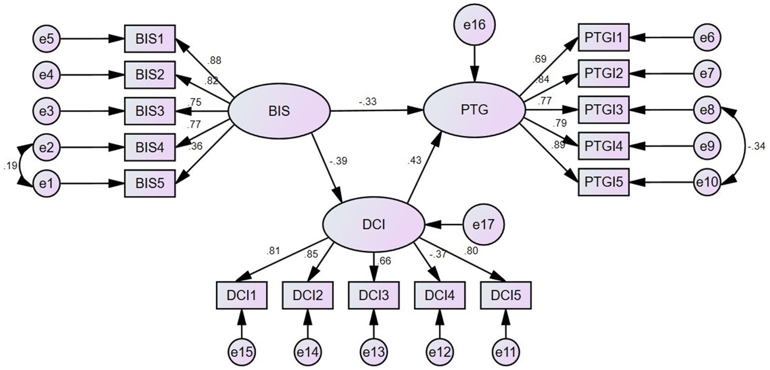 The level of body image was negatively correlated with post-traumatic growth (r = −0.462, p < 0.01); and the level of body image was negatively correlated with dyadic coping (r = −0.308, p < 0.01). And dyadic coping was positively associated with post-traumatic growth (r = 0.464, p < 0.01). The structural equation modeling results supported the mediation model with the following model fit indices, chi-square to degrees of freedom ratio (χ2/df = 2.05), goodness of fit index (GFI = 0.93), comparative fit index (CFI = 0.99), canonical fit index (NFI = 0.93), incremental fit index (IFI = 0.99), non-canonical fit index (TLI = 0.99) and the root mean square of the difference in approximation error (RMSEA = 0.03). Body image and dyadic coping directly affected post-traumatic growth (β = −0.33, p < 0.05; β = 0.43, p < 0.05). And body image indirectly influenced post-traumatic growth through dyadic coping (β = −0.17, p < 0.05).