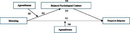 H6: Agreeableness moderates the positive relation between mentoring through balanced psychological contract and proactive behaviors such that the relationship is strengthened when Agreeableness is high.