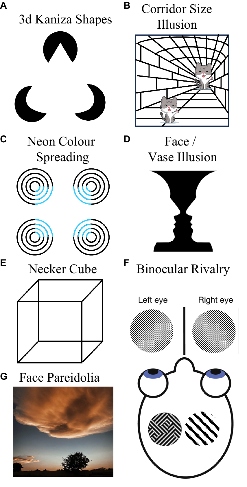 Some visual phenomena that Loren does not experience stereotypically. She cannot discern 3D Kaniza shapes (A), she does not immediately experience the Corridor Size Illusion (B), she does not experience neon color spreading (C), she cannot see the vase in Rubin face/vase illusion (D), she cannot see a 3D cube in the line drawings of Neckers cube (E), she does not experience periods of dominance during binocular rivalry (F), and she does not experience face Pareidolia (G).