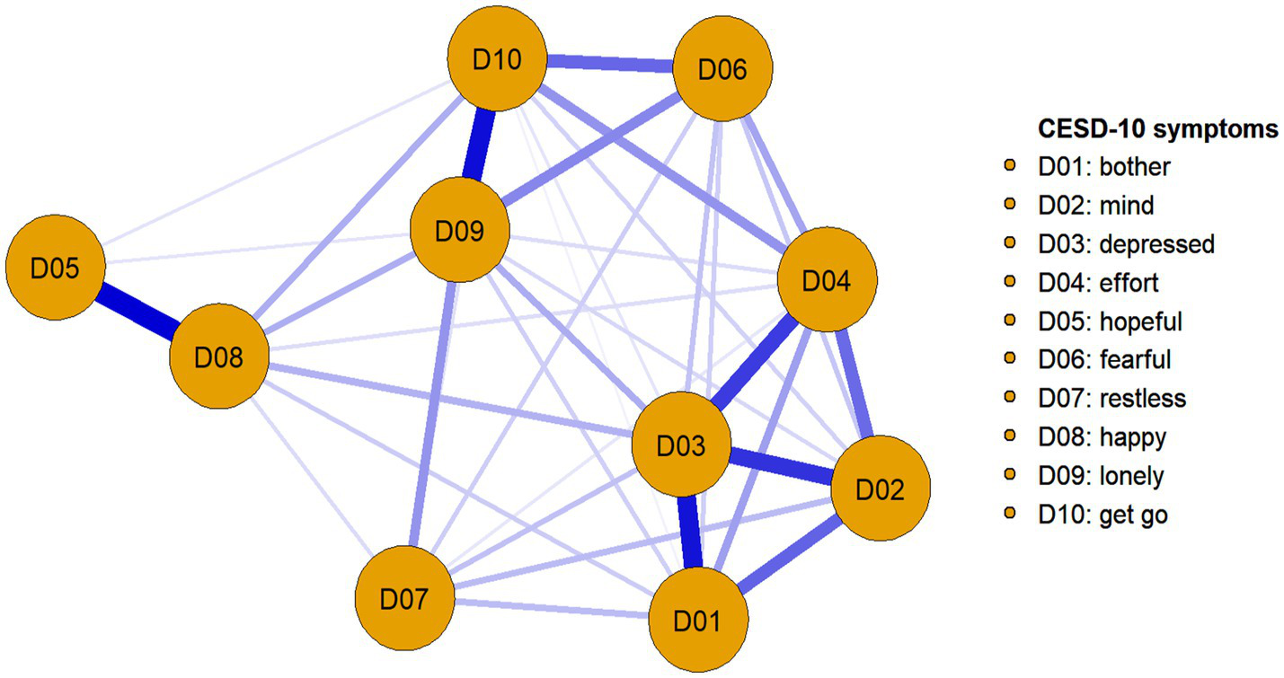 Age, gender, education, marital status, hukou, religious faith, living with children, household per capita consumption, chronic disease, and physical disability were used as control variables in this research. In this research, all statistical analyses were performed with R software. We estimated and visualized the structure of depressive symptoms by using the R package of qgraph. This package can automatically compute the appropriate correlations according to the types of variables (Maccallum and Bryant, 2020). We chose Spearman’s rank correlation to estimate regularized partial correlation networks (Epskamp and Fried, 2018) due to the ordinal nature of the item. To control for false positives and create a sparse and interpretable network, the GLASSO procedure used the graphical “least absolute shrinkage and selection operator” (LASSO) regularization with extended Bayesian information criterion (EBIC) model selection (Epskamp and Fried, 2018; Maccallum and Bryant, 2020). We used a regularization approach with tuning parameter γ (specifying the level of sparsity) set to 0.5 (Foygel and Drton, 2010) to compute potential spurious relationships. A psychopathology network is displayed graphically as a set of symptoms (nodes), with nodes connecting through a set of relations (edges). However, recent literature suggested that non-regularized networks might be preferable in some cases, especially for large sample sizes. Since this is not the case for our sample, we presented the non-regularized partial correlation network in Supplementary Figures S1, S2.