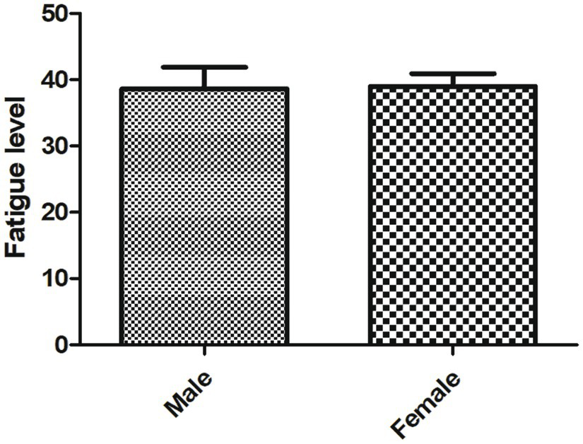 A total of 212 active SLE patients were included. The FSS score of 118 patients had ≥36, indicating that they had certain degree of fatigue, the incidence of fatigue in active SLE patients was 55.66%. As shown in Table 1, there were statistical differences in the fatigue score between SLE patients with different age and course of SLE (all p < 0.05). There were no statistical differences in the fatigue score between SLE patients with different gender (Figure 1), marital status, educational level, medical expenses payment method, home place and family monthly income (all p > 0.05).