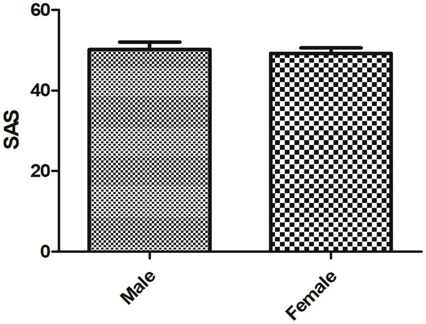 As shown in Table 2, the average SAS score of SLE patients was 50.71 ± 7.85, including no anxiety in 101cases, mild anxiety in 79 cases, moderate anxiety in 22 cases and severe anxiety in 10 cases. No statistical difference in the SAS score was observed between male and female SLE patients (Figure 2).