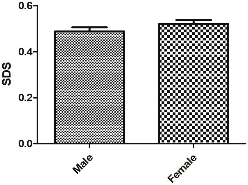 As shown in Table 3, the average score of depression severity index in SLE patients was 0.51 ± 0.23. There was no depression in 134 cases, 63 mild depression cases, 12 moderate depression cases and 3 severe depression cases. No statistical difference in the SDS score was observed between male and female SLE patients (Figure 3).