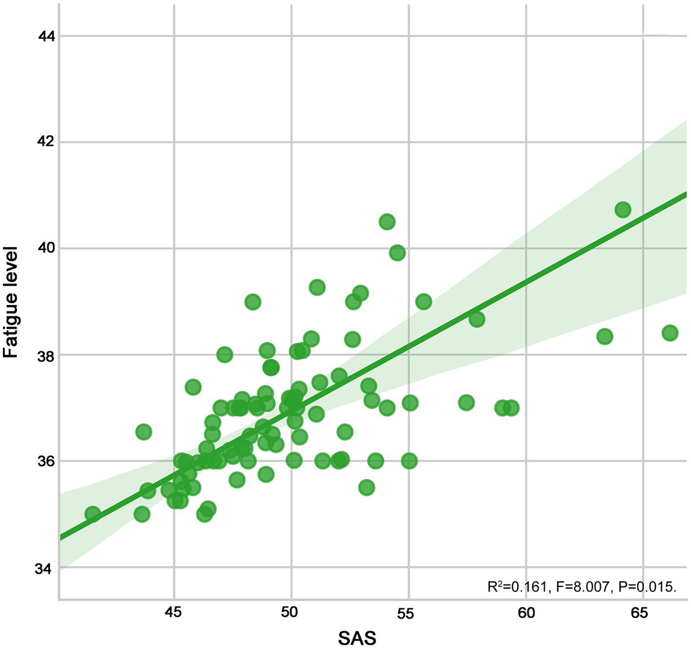 As shown in Table 4 and Figures 4, 5, fatigue was positively correlated with anxiety (r = 0.559) and depression (r = 0.591) in patients with SLE (all p < 0.05).