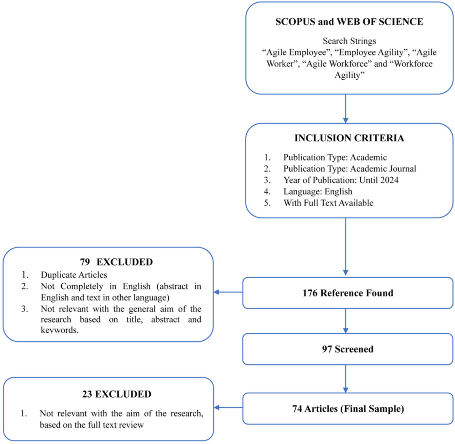 This study applies several inclusion and exclusion criteria. Scopus and Web of Science were selected as the primary databases to narrow the scope of the research (Hung and Law, 2011; Zott et al., 2011; Battisti et al., 2019; Castañer and Oliveira, 2020). These were chosen due to their broad coverage and relatively well-maintained quality control (Harzing and Alakangas, 2016; Schotten et al., 2017). In the subsequent step, titles, abstracts, and keywords of articles were explored using keyword combinations based on “Agile Employee,” “Employee Agility,” “Agile Worker,” “Agile Workforce,” and “Workforce Agility.” To include all pertinent research without temporal constraints, the search was not confined to a specific period but included articles up to 2024. The next step is to prioritize contributions with the highest impact and visibility. “Articles” are specifically chosen as the type of document, and “academic journals” (peer-reviewed) as the type of publication (Battisti et al., 2021; Christofi et al., 2021). Scientific publication articles are prioritized because they are considered the most reliable and authoritative sources of information (Anderson et al., 2020; Smela et al., 2023). Articles have been peer-reviewed and undergone a rigorous evaluation, so the research was conducted with high scientific rigor. Also, their findings are accurate and trustworthy (Anderson et al., 2020; Azarian et al., 2023; Smela et al., 2023). Consequently, editorials, perspectives, conference proceedings, book chapters, or other contributions lacking peer review scrutiny were excluded (López-Duarte et al., 2016). Inclusion criteria were limited to contributions in the English language, excluding those in other languages (Follmer and Jones, 2018), both due to the language constraints of research experts (Battisti et al., 2021) and the perceived limited impact of such contributions on international academic discourse (Gallardo-Gallardo and Thunnissen, 2016). In addition, only articles with available full text were considered (Vrontis and Christofi, 2021). The initial putative sample of articles meeting these criteria amounted to 176.