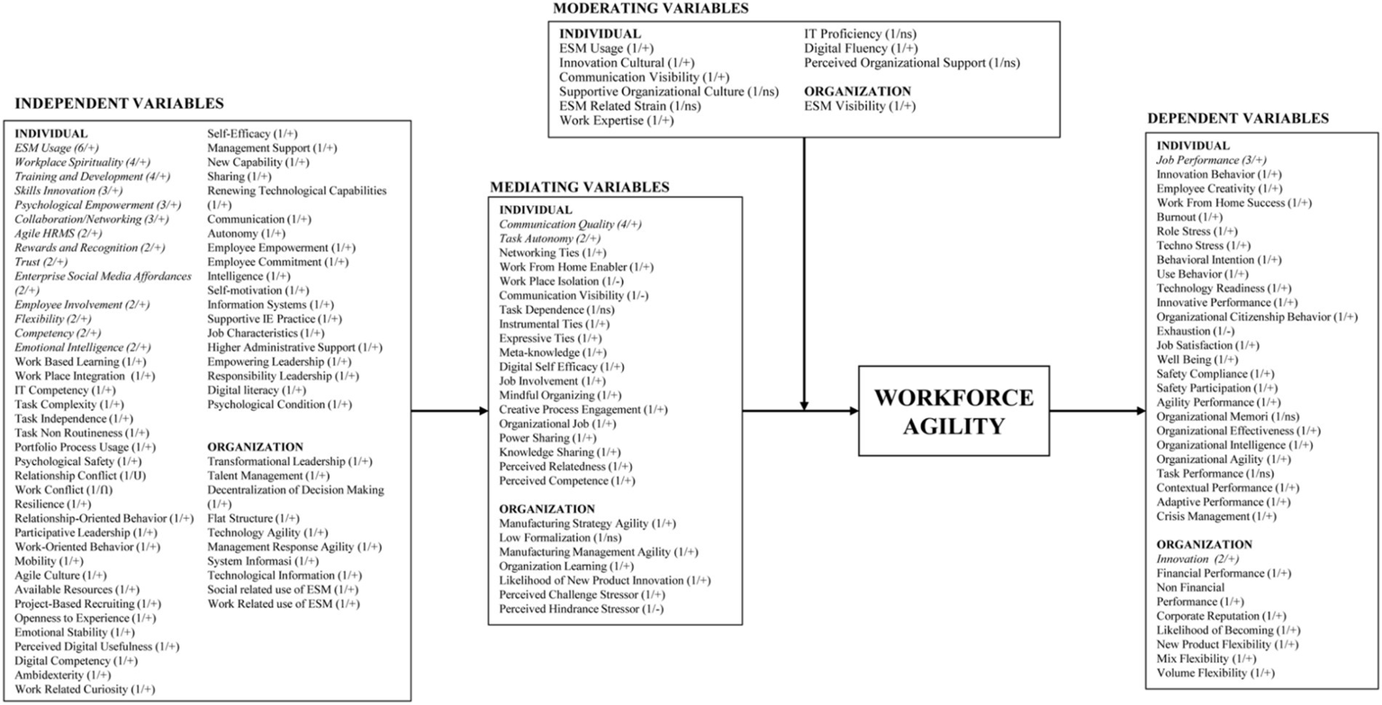Figure 2. Summary of variables – a nomological network. Source: Data processed. The parentheses contain information about the number of prior studies examining the given variables and the results. Variables in italics have been studied frequently. (+) = positively related; (−) = negatively related; (ns) = non significantly related to workforce agility; ESM, enterprise social media.