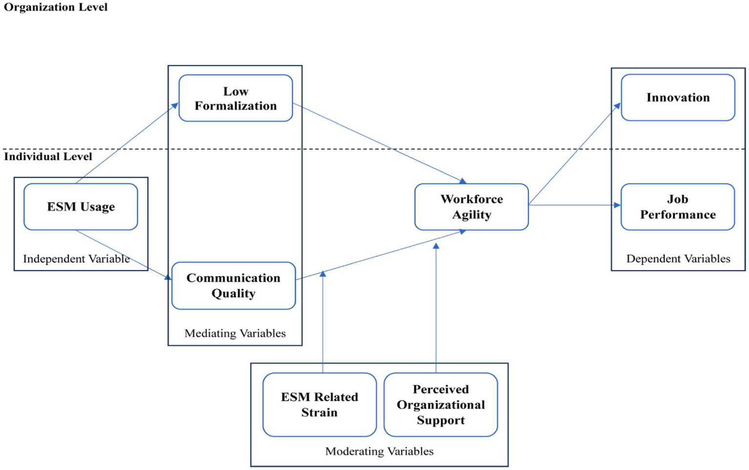 The contribution to the understanding of workforce agility includes an examination of variables through a nomological network and the presentation of theories underlying these relationships. The identified variables in the literature are at two levels: individual employees (e.g., training and development, skills innovation, psychological empowerment, competency, emotional intelligence, work-based learning, workplace integration, relationship-oriented behavior, creative process engagement, job involvement) and organizations (e.g., manufacturing strategy agility, manufacturing management agility, organization learning, and the likelihood of new product innovation) (Qin and Nembhard, 2010; Muduli and Pandya, 2018; Petermann and Zacher, 2022; Hanu et al., 2023). This observation shows less attention has been given to the relationship between workforce agility and variables at the organizational level than at the individual level. Concerning dependent, mediating, and moderating variables, it is essential to prioritize causal factors of workforce agility at the team level. According to scholars researching other behaviors, investigating crucial causal factors is essential to provide a strong foundation for developing workforce agility. These causal factors may relate to any of the three levels: individual, team, and organizational.