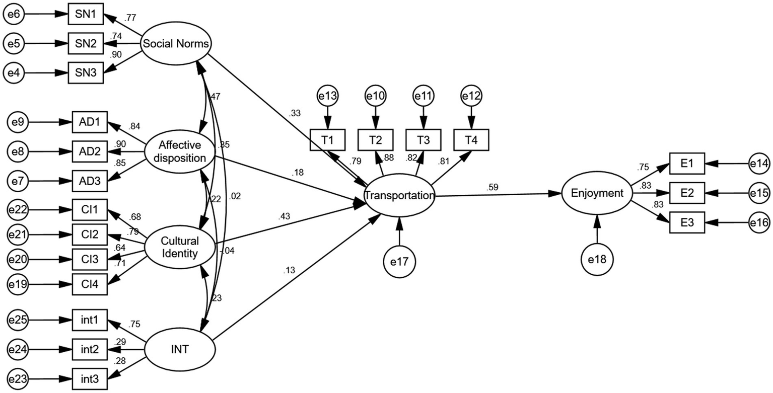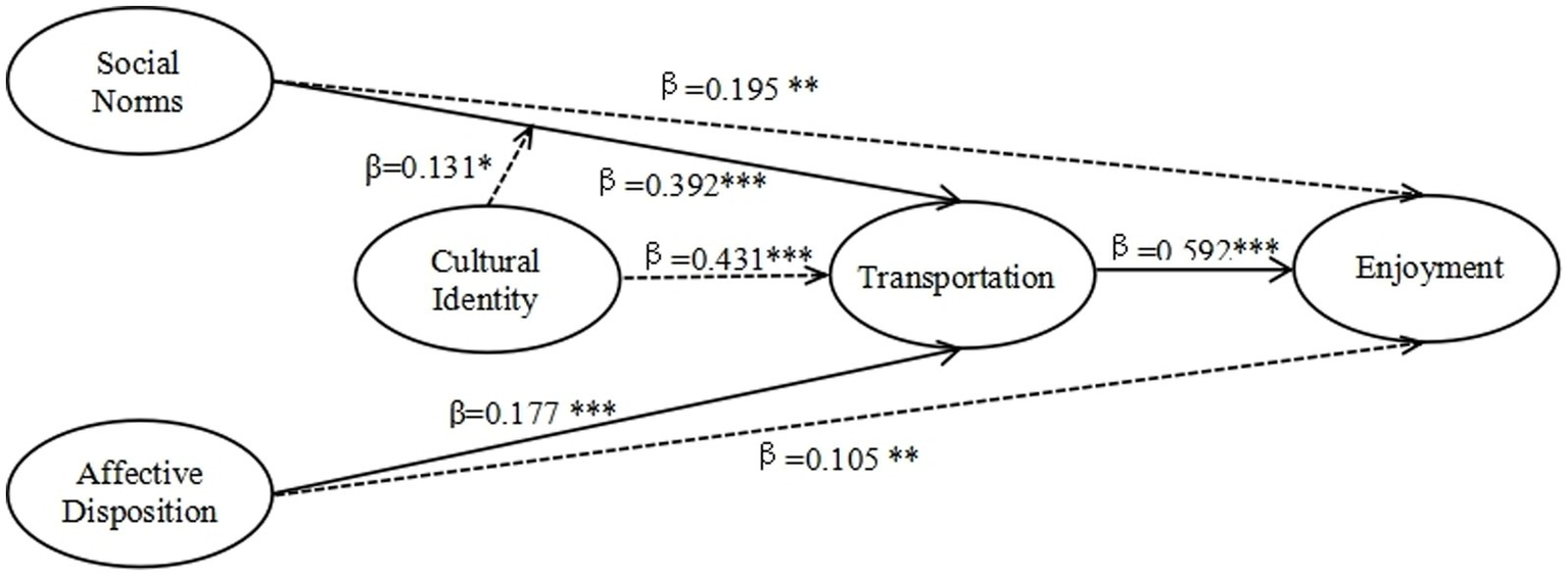 Results: The results indicate that social norms, cultural identity, and affective disposition significantly influence transportation and enjoyment. Furthermore, the influence of cultural identity on social norms has a positive moderating effect on transportation.