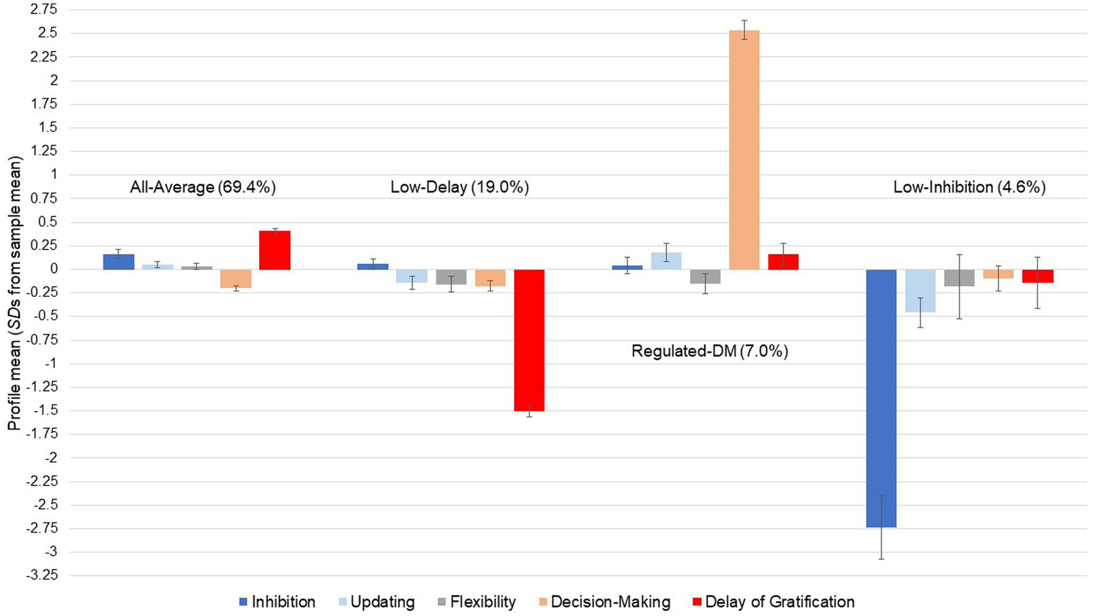 Latent person-oriented research is becoming more popular within developmental and cognitive psychology as it identifies meaningful subgroups within larger samples that deviate in their performance or characteristics from the sample’s mean and would otherwise be overlooked. Within a large cohort of children between 9 to 10 years, Chaku et al. (2022) pinpointed four subgroups or latent profiles with different expressions of cool EF facets. Along with an average, a high, and a low EF profile, the authors identified a low inhibition profile. These EF profiles were characterized by gender and socio-economic status (SES), and predicted later differences in reported social, attentional, and externalizing problems. Another study restricted to multilingual preschoolers identified three profiles consisting of the three cool EF facets: these profiles were mainly characterized by the manifestation of cognitive flexibility (above- or below-average performance), likely due to the unique sample’s linguistic abilities which were argued to influence the cool ability to shift flexibly between rules and schemas (Relyea et al., 2023). While other developmental studies also utilized EF in the generation of unique cognitive profiles, they focused on specific populations (i.e., children with ADHD or ASD; Dajani et al., 2016) or neglected certain EF facets, which leads to a poor differentiation of EF performance within the respective profiles (Litkowski et al., 2020). While initial attempts to profile EF in childhood have been made, the present study makes an important contribution by investigating a comprehensive set of both cool and hot EF skills to provide a detailed picture of meaningful subgroups of children who differ in their executive abilities both intra- and interindividually.