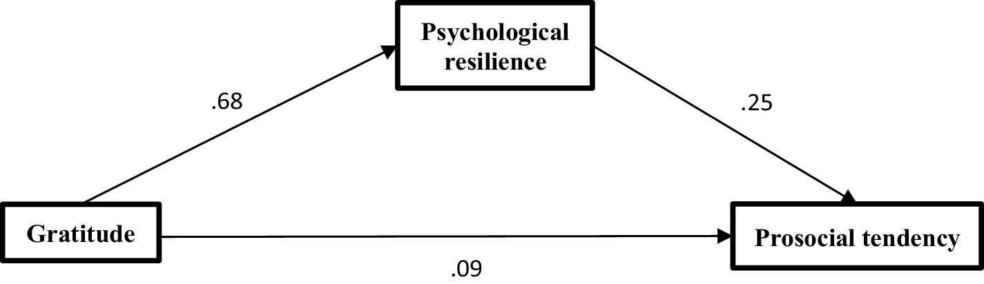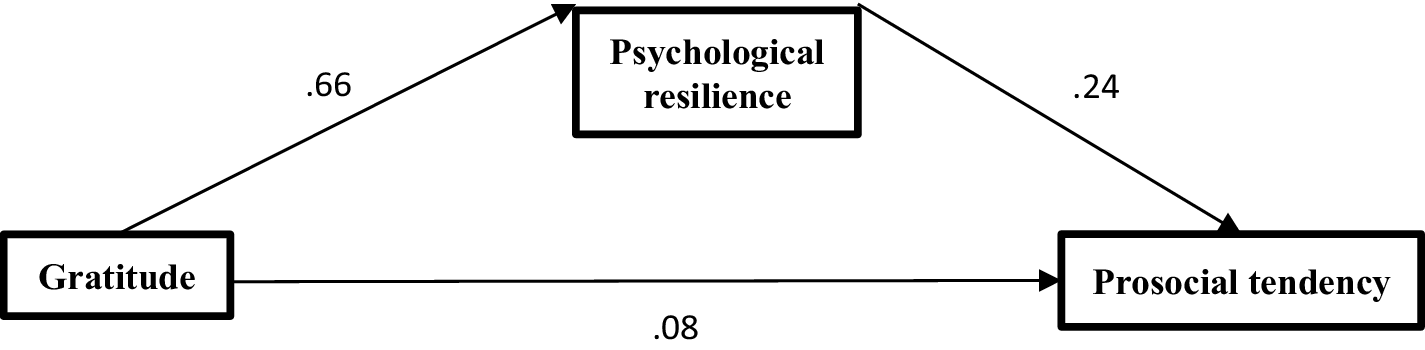 Furthermore, empirical evidence provided by Jans-Beken et al. (2019) corroborates the proposed mediation model, demonstrating that psychological resilience acts as a mediator between gratitude and well-being outcomes. Building upon these findings, our current study seeks to explore the potential mediating role of psychological resilience in elucidating the relationship between gratitude and prosocial tendency.
