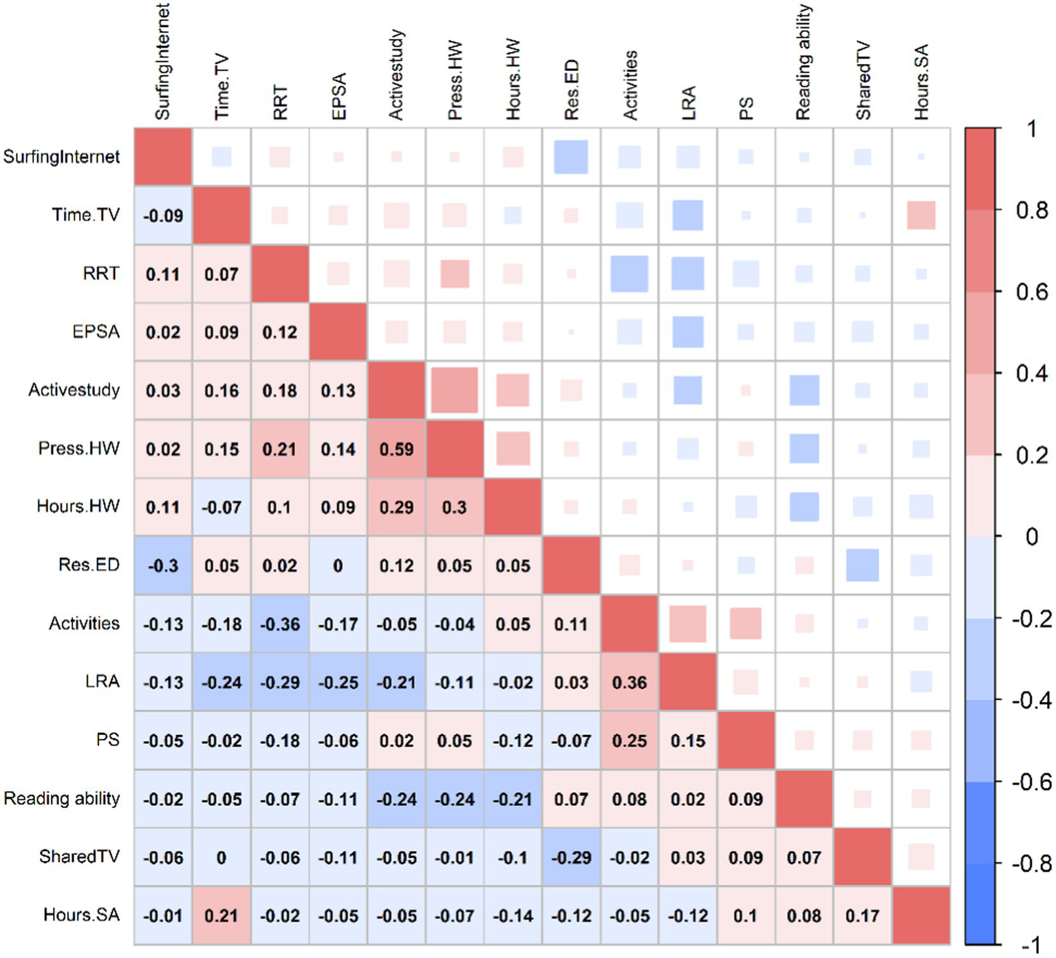 Based on the HLE scale designed by He et al. (2014), this study made some changes to the items. Ten variables reflected the home literacy environment, such as Literacy-related activities, restrictions on using electronic devices, usage of electronic devices, shared TV, children’s learning habits, completion of homework by children, whether the child participated in extracurricular activities, frequency of encouraging children to participate activities and hours of outdoor. Children’s literacy-related behaviors, such as regular reading time, were measured according to the HLE variables assignment table. The higher the frequency of the behavior, the higher the score. The cumulative score of each item ranged from 0 to 24 among all the students (see the details in Supplementary Table S1).