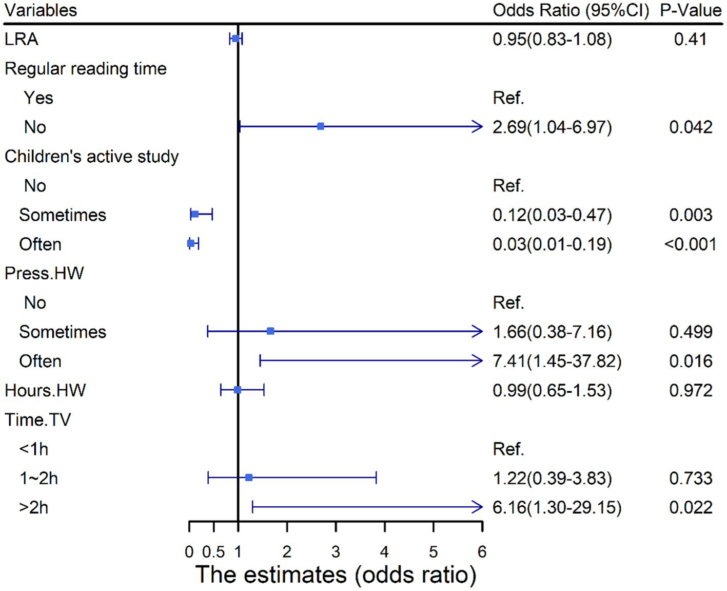 Considering that families share both genetic material and environmental factors, it’s conceivable that dyslexia might also arise as a consequence of environmental influences linked to low literacy levels (Torppa et al., 2022). Many studies have shown that the occurrence of dyslexia is closely related to family environment (Dilnot et al., 2017; Huang et al., 2021). The home literacy environment (HLE) is used to describe the interactions, resources, and attitudes that children experience at home related to literacy, such as parent–child literacy-related activities, family books, usage of electronic devices etc. (He et al., 2014). Previous studies have studied the HLE from various aspects. Meanwhile, extensive research has underscored the relationship between the HLE and children’s reading development, acknowledging that while certain aspects of HLE, including quality interactions and access to reading materials, positively contribute to reading skills (Lau and Richards, 2020; Torppa et al., 2022), careful consideration is required regarding the role of screen time, which may have varied impacts. Recent American Speech-Language-Hearing Association (ASHA) recommendations suggest that increased screen time, instead, delays child brain and language development, aligning with the results of a cross-sectional study in the United States (Hutton et al., 2020). The HLE explains 12–18.5 percent of the variation in children’s language skills (Niklas et al., 2020). Frank Niklas et al. stated that the relationship between parental attitudes toward shared reading and children’s language ability was mediated by the HLE (Niklas et al., 2020). A Finnish longitudinal study also found that the HLE plays a crucial role in the development of dyslexia in children (Torppa et al., 2022). Importantly, a good reading atmosphere at home was a conducive condition for promoting the development of children’s early reading skills (Hamilton et al., 2016). Rashid conducted a study among dyslexic children and found a significant correlation between HLE and children’s passage comprehension as well as spelling scores (Rashid et al., 2005). Similarly, recent research has confirmed that Chinese children with dyslexia often come from homes with poor literacy environments (He et al., 2014; Feng et al., 2022). Therefore, the HLE is a crucial factor in the development of reading ability in children.