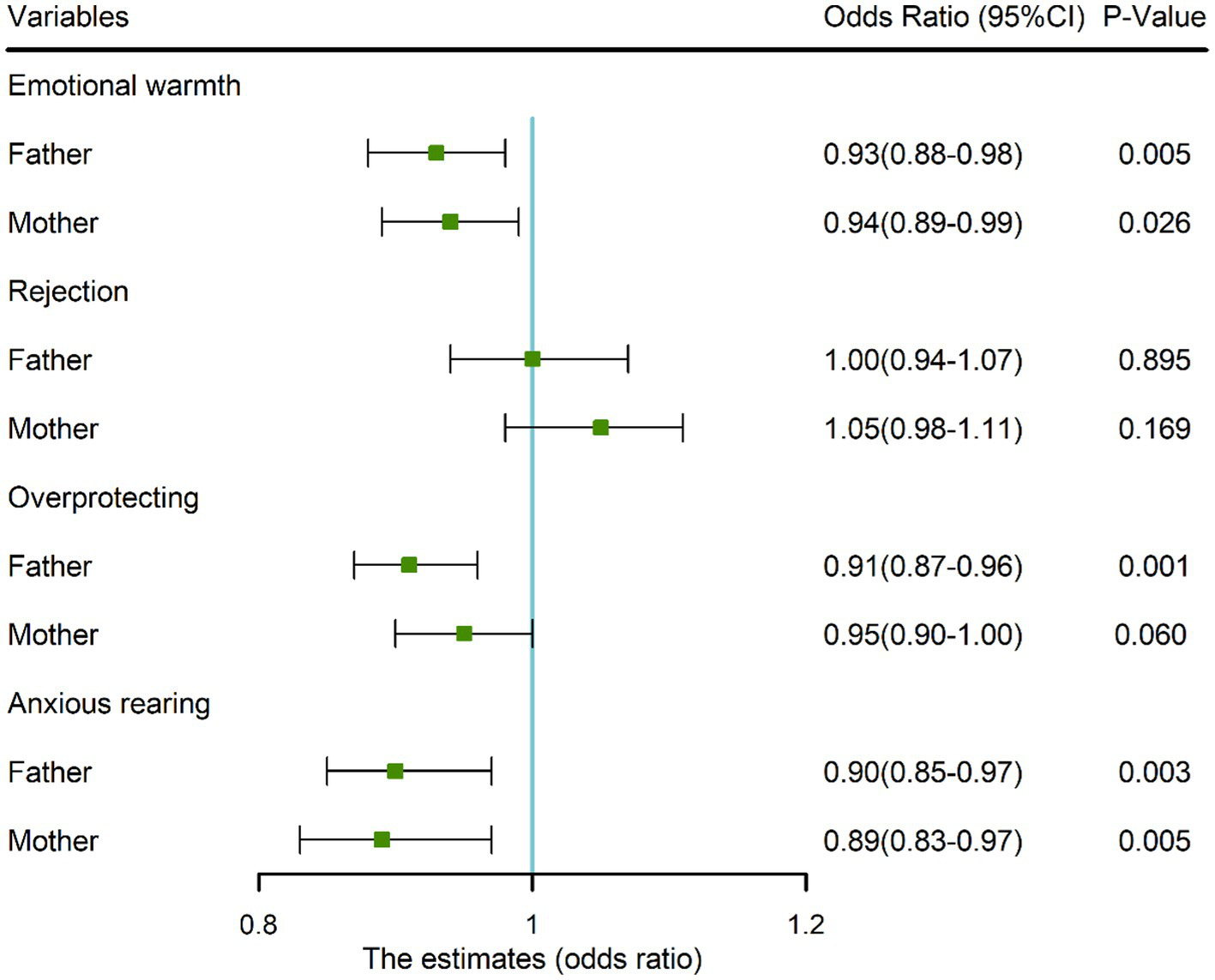 The EMBU-C is a powerful and objective tool which is used to evaluate the current relationship between parenting styles and children’s mental health. It is a self-report tool used to assess children’s perceptions of their parents’ parenting styles, filled out by the children themselves. Essentially, the use of questionnaires to understand children’s perspectives is valuable for exploring how various aspects of home life. The Chinese version (EMBU-C) for school-age children and adolescents, as translated and revised by Liming Tie et al., was applied in our study (Liming, 2018). The EMBU-C includes four dimensions, namely emotional warmth (EW), rejection (R), overprotecting (O), and anxious rearing (AR), made up of 10 items, respectively. The participants were asked to respond twice to each question item, evaluating the current parenting styles of their fathers and mothers, respectively. The items were rated on a four-point Likert scale from never (1 point) to always (4 point) where the higher the score on a dimension, the greater the tendency to represent parenting styles on that dimension. The Cronbach’s alpha of the EMBU-C was 0.82, and test–retest reliability was between 0.72 and 0.90. Statistical validation of the EMBU-C questionnaire has shown possess high reliability and validity across diverse cultural contexts, making it an appropriate tool for our research.