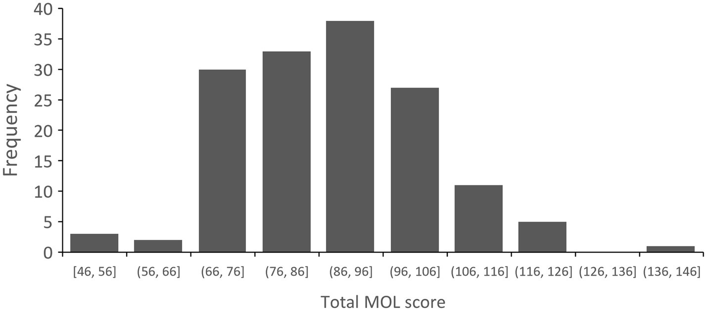 In this cohort of 150 patients, the MOL assessment revealed a general inclination toward a lower sense of MOL, as presented in Figure 1. The median MOL score for the cohort was 88, with an interquartile range of 77 to 99, notably below the threshold of 92, which statistically substantiates the prevalence of a significantly low level of MOL within the group (t = −2.735, p < 0.05). A small fraction, representing 11 cases (7.3%), scored above 112 points, signifying a high sense of MOL. The middle group, comprising 46 cases (30.7%), had scores ranging from 92 to 112 points. However, the majority, with 93 cases (62.0%), fell below the 92-point threshold, indicating a low sense of MOL. The distribution of MOL scores adhered to normality (p > 0.05) by conducting the Shapiro–Wilk test, suggesting no significant skewness or outliers affecting the overall data trend. This normality also validates the use of one-way ANOVA for further analysis.