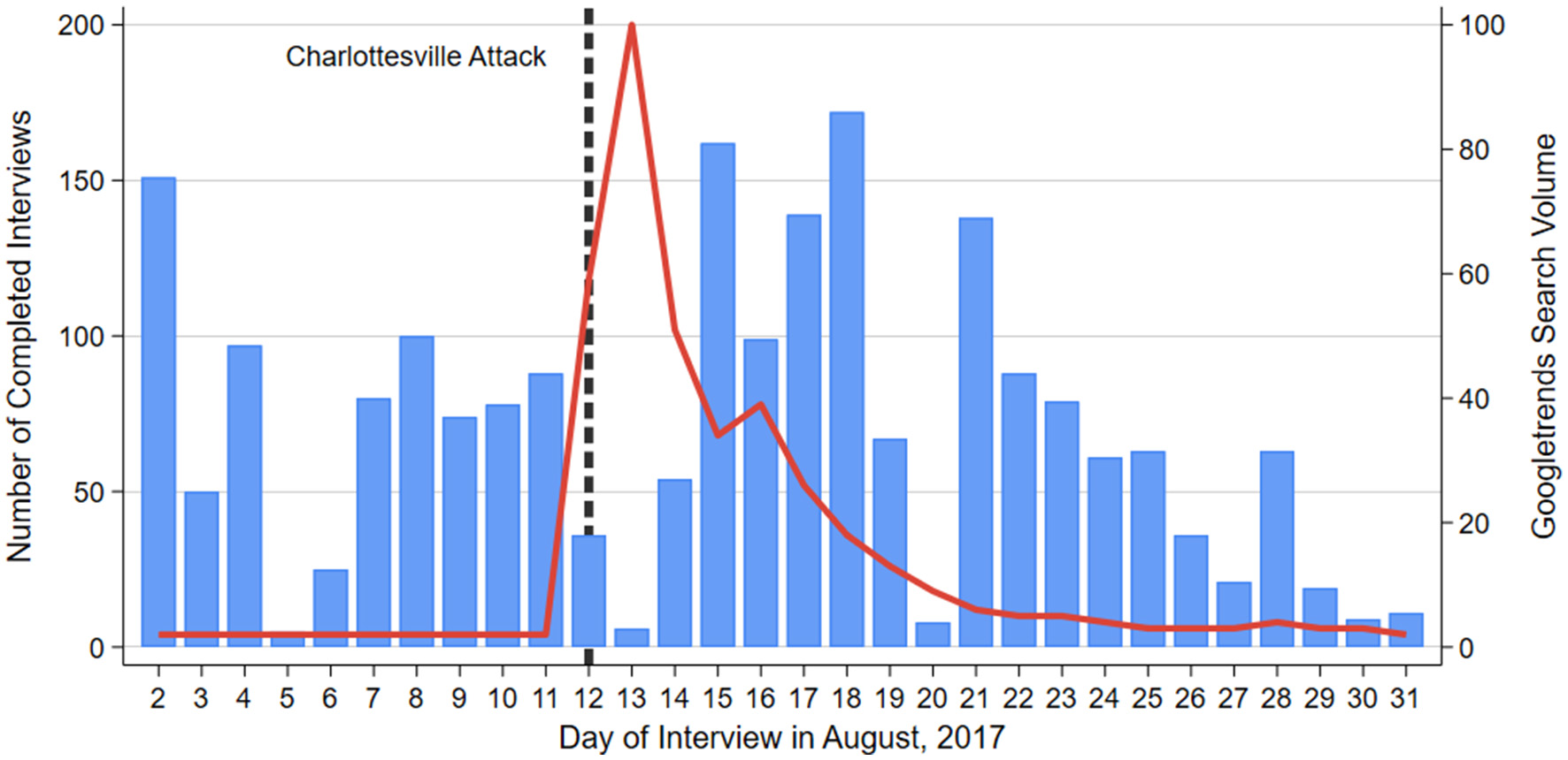 We believe that a UESD design is appropriate for this event and this dataset for several reasons. First, as shown in blue in Figure 2, a sizable number of surveys were completed before and after Charlottesville, allowing for a meaningful comparison between treatment and control groups. Second, as indicated by the red line, there is no evidence of an anticipation effect. Search interest in “Charlottesville” rose dramatically on August 12 and 13 before slowly returning to roughly pre-rally levels by the end of the month. This suggests that the event was unexpected, and despite the fact that the rally was planned in advance, few would have been aware of it prior to the widespread news coverage after the car attack. Third, balance tests reveal that pre-rally respondents do not differ dramatically from post-rally respondents in a variety of demographic variables, as shown in Supplementary Tables S4–S7.