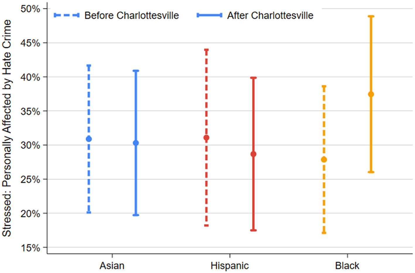 We first show that there was an increase in anti-Black hate crimes in the 2 weeks following the Charlottesville incident. We also find a corresponding increase in stress due to the perception of personal vulnerability to hate crimes among African-Americans. However, we do not observe a significant increase in levels of stress following the trigger event among Hispanics and Asian Americans.