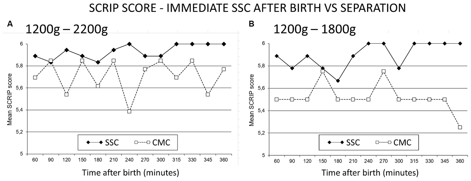 Figure 3. SCRIP score—immediate SSC after birth vs. separation. The Stability of CardioRespiratory System In Preterms (SCRIP) score assigns 0, 1 or 2 points for heart rate, respiration and oxygen saturation parameters, adding to 6 to be deemed stable. (A) Infants between 1,200 g and 2,200 g randomized to SSC (skin-to-skin contact) were stable at 6 h, those in CMC (conventional method of care) did not achieve the full score. (B) Infants 1,200 g to 1800 g in CMC were more unstable at 6 h. Reproduced from Bergman et al. (2004) with permission from Wiley.