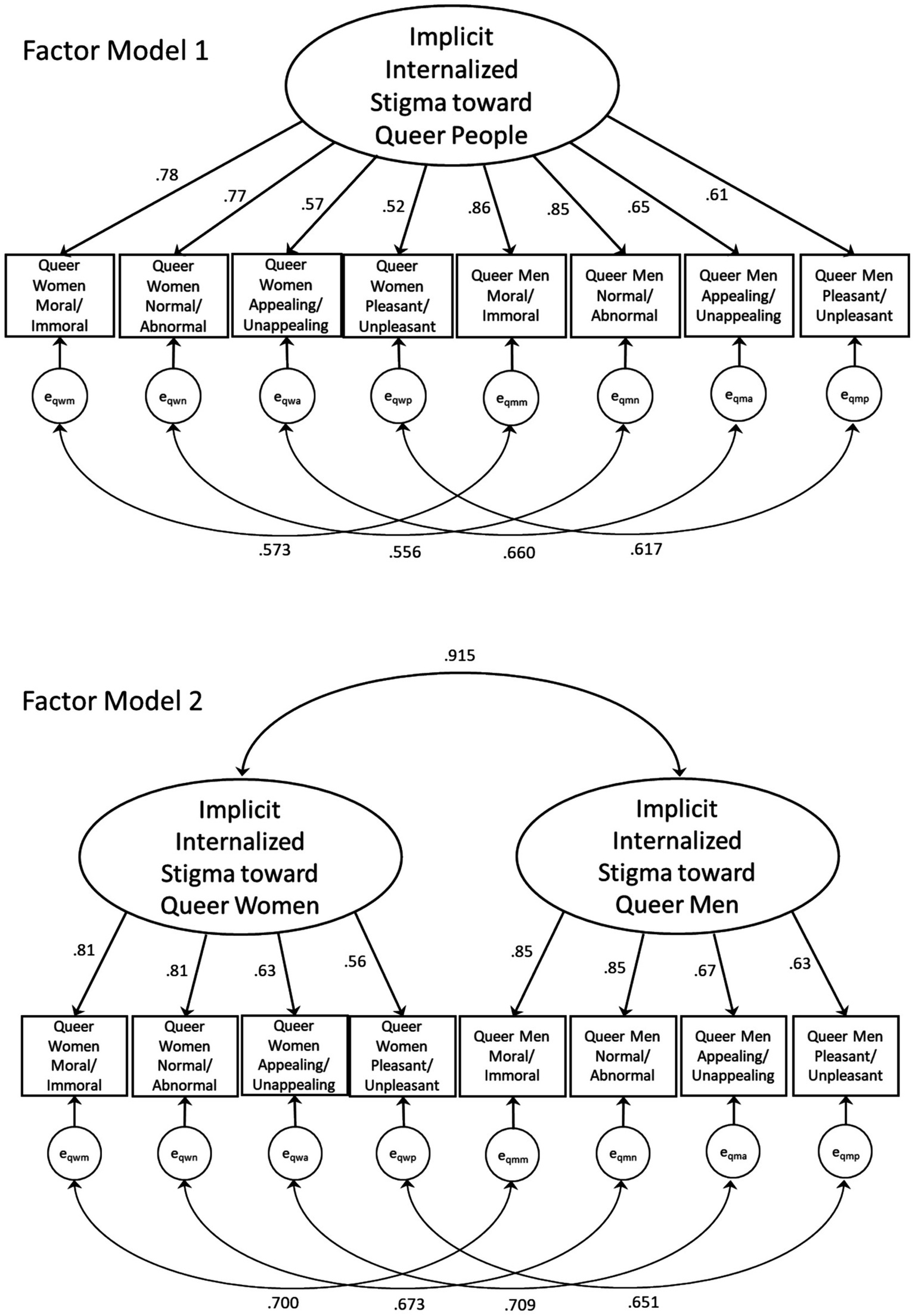 Results showed that the two-factor model best fit the data. This indicates that although implicit attitudes toward queer men and women are highly correlated, implicit internalized stigma differentiated by two gender stimuli groups (men and women) more accurately reflects the data. There was evidence of convergent validity as Internal-SOS-AMP scores showed small positive associations with explicit internalized stigma. Regarding divergent validity, Internal-SOS-AMP scores were inversely related to affirmation of a queer identity. Reliability results for the Internal-SOS-AMP showed good internal consistency and acceptable test–retest reliability.
