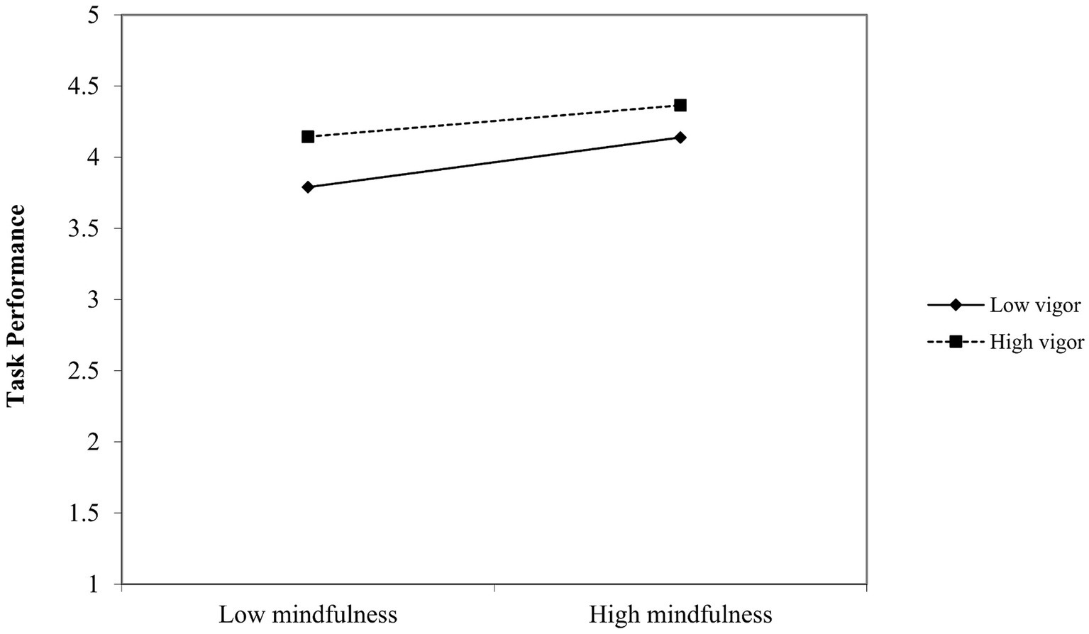 Multilevel analyses showed that both daily mindfulness and daily vigor positively predict self-reported task performance. The interaction between mindfulness and vigor was significant. The results suggest that high levels of mindfulness can compensate for low levels of vigor, and vice versa.