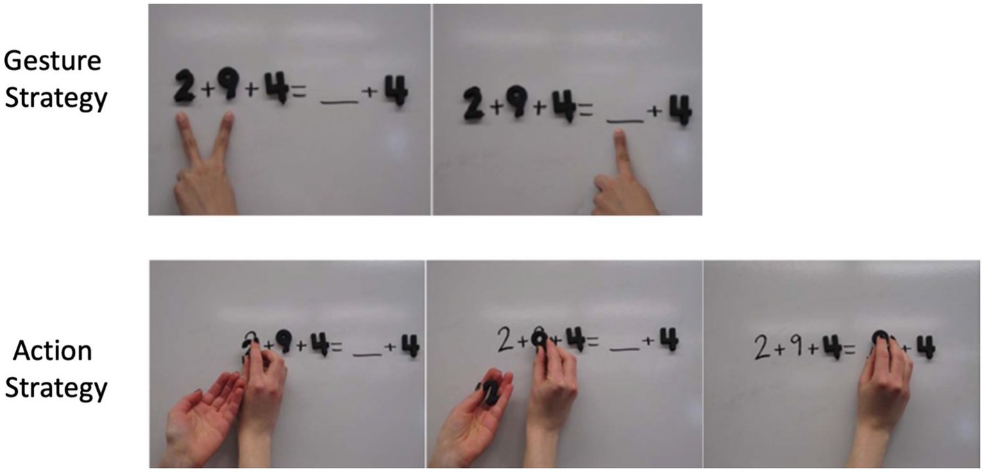 Furthermore, there are many different ways that gesture and particularly action can be used to teach mathematical equivalence beyond the approach taken in our study. We did not design this study to develop the best way to teach this concept to children, and it may be that the movements used (i.e., picking up or gesturing toward numerical tiles and grouping them together) required a big conceptual leap to connect those movements to the concept. Alternative approaches could be developed that might better support learning. For example, using discrete, non-symbolic manipulatives (e.g., beads or base 10 blocks) that can be grouped together might provide children with a more transparent instantiation of the grouping strategy in action than the one used here. However, whether students combine symbols (that need to be added together to get the answer) or beads (that need to be counted together to get the answer), they still need to grasp the link between the symbols/beads and the equation, which is often the stumbling block in learning mathematical concepts. Future work needs to directly compare different ways of instantiating strategies in gesture and action to assess their impact on learning.
