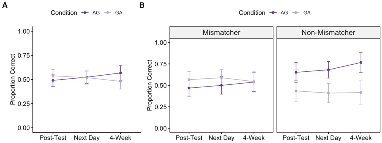 Figure 4. Post-test performance over time following instruction with action-then-gesture training (AG, dark purple) and gesture-then-action training (GA, light purple) training. Panel A shows average proportion correct across all children and Panel B shows average proportion correct for children with high implicit knowledge (“Mismatchers”) and low implicit knowledge (“Non-Mismatchers”). Error bars represent standard error of the mean of the participant-level data.