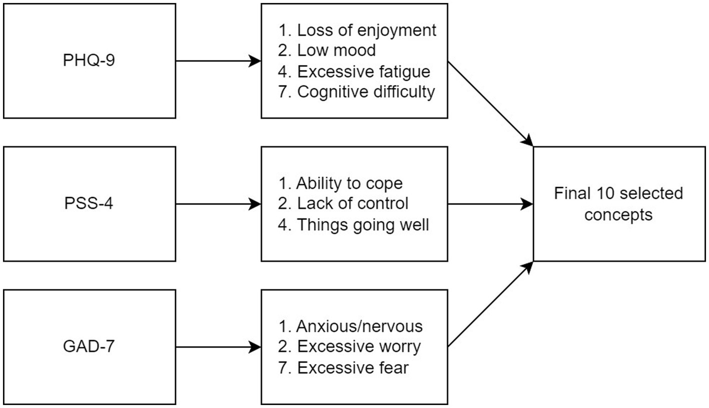 Ten key concepts were identified as the most important indicators of mental health in this sample of patients with chronic gastroduodenal symptoms. These concepts were derived from specific items across three scales: items 1, 2, 4, and 7 of the PHQ-9; items 1, 2, and 3 of the PSS-4; and items 1, 2, and 7 of the GAD-7 (Figure 2). Further detail about how these 10 concepts were selected is provided in the Supplementary results.